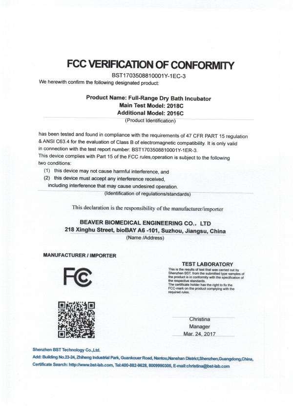熱烈祝賀蘇州海貍生物醫(yī)學(xué)工程有限公司自主研發(fā)生產(chǎn)的全溫金屬浴系列產(chǎn)品(2016C、2018C)順利通過(guò)CE、FCC認(rèn)證。