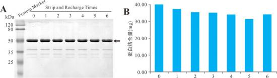 圖A. 再生6次后磁珠結(jié)合目標(biāo)蛋白檢測圖譜 圖B. 再生6次后磁珠的蛋白結(jié)合量數(shù)據(jù)圖